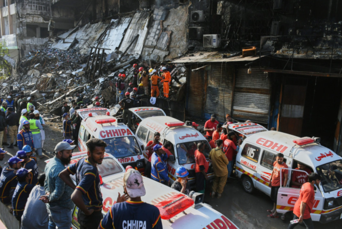 Zjarrfikësit pakistanezë po vazhdojnë nxjerrjen e trupave nga rrënojat, ndërsa pjesa e mbetur e objektit u shemb me vinç për shkak të rrezikut të rrëzimit të papritur. Shumë banorë lokalë u mblodhën në vendin e ngjarjes dhe protestuan kundër qeverisë, duke akuzuar vonesën e ndërhyrjes së zjarrfikësve.