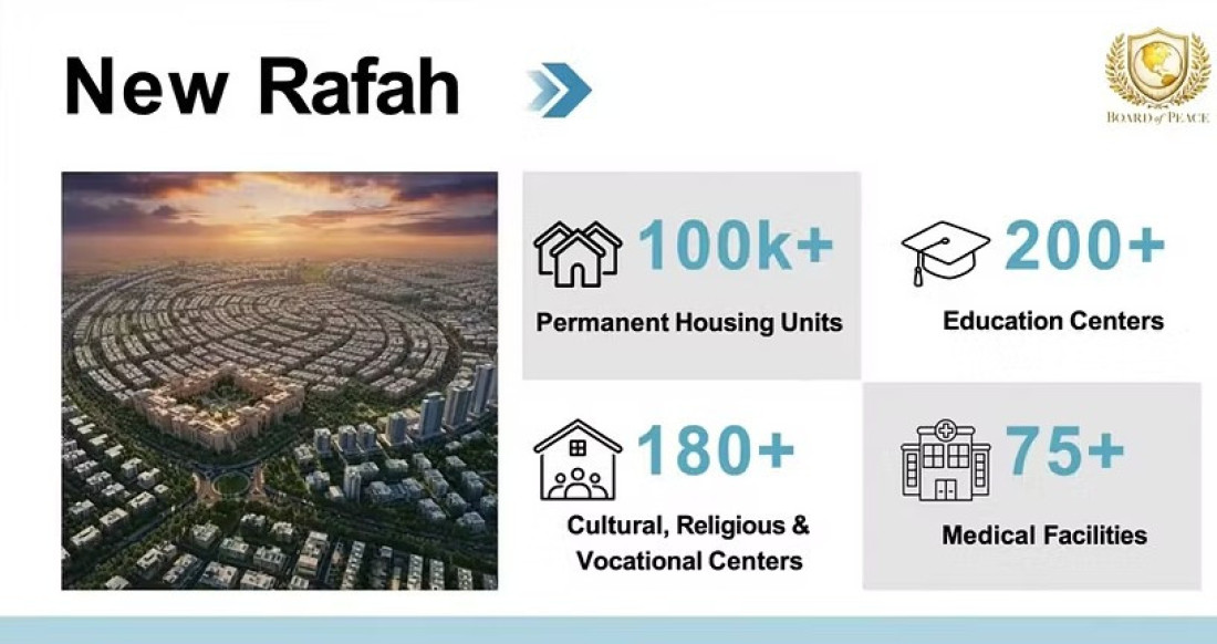 Kushner premtoi ndërtimin e mbi 100 mijë banesave, 200 shkollave dhe 180 qendrave kulturore në Rafah dhe Khan Younis. Gjithashtu, projekti parashikon ndërtimin e rreth 180 kulla për turizmin bregdetar, duke e kthyer Gazën në “Las Vegas-in e Lindjes së Mesme”.