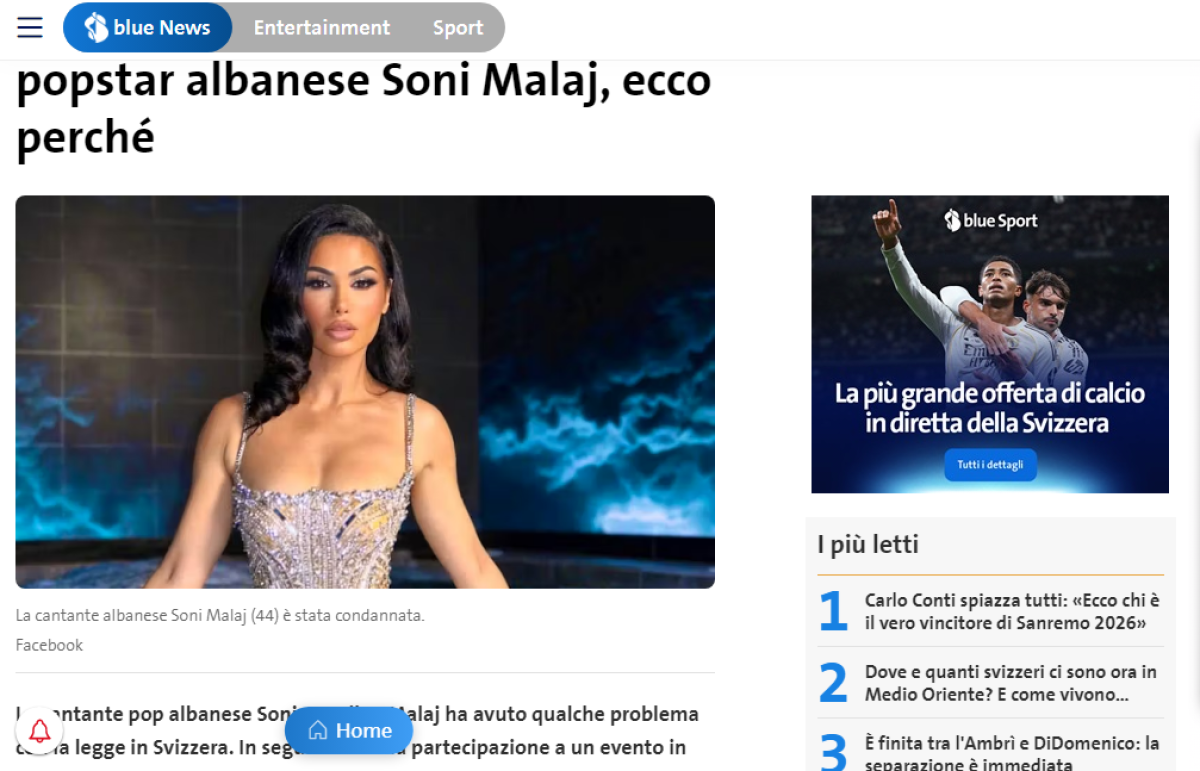 Këngëtares së njohur shqiptare, Soni Malaj i është ndaluar hyrja në Zvicër për një periudhë 2-vjeçare, pas problemeve ligjore që lidhen me një vizitë të saj në pranverën e vitit 2024. Vendimi është konfirmuar nga Gjykata Federale Administrative. Çështja lidhet me ngjarjen e prillit 2024, kur këngëtarja udhëtoi drejt Zvicrës dhe një ditë më pas u kontrollua dhe u arrestua në zonën VIP dhe prapa skenës së “Boleros Club”.