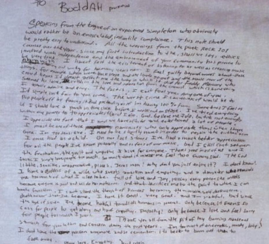 Sipas këtij burimi, niveli i heroinës në trupin e Cobain ishte aq i lartë sa e bënte të pamundur që ai të kishte qëlluar vetë. Po ashtu, ai thekson se në armë nuk u gjetën gjurmë gishtash dhe se pesë rreshtat e fundit të letrës së supozuar të vetëvrasjes nuk përputheshin me shkrimin e tij.