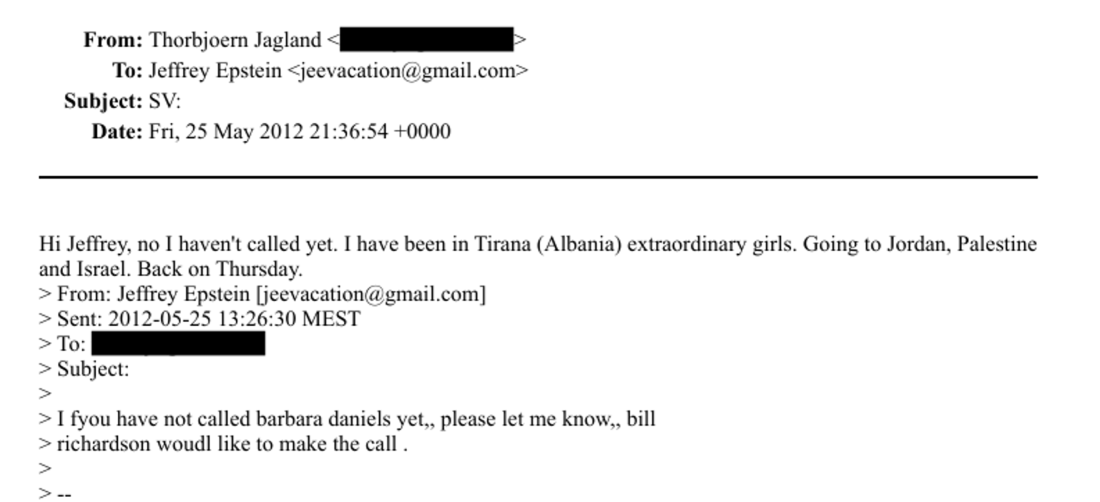 Në një prej komunikimeve me Jeffrey Epstein, është publikuar e-mail që Jagland i nisi personazhit kontrovers më 25 maj 2012. “Kam qenë në Tiranë, atje ka vajza të jashtëzakonshme”, niste mesazhi i zyrtarit norvegjez, që vetëm pak orë më parë kishte zhvilluar takime të nivelit të lartë me kryeministrin e asaj kohe, Sali Berisha, presidentin në detyrë Bamir Topi dhe ministrin e Jashtëm, Edmond Haxhinasto.
