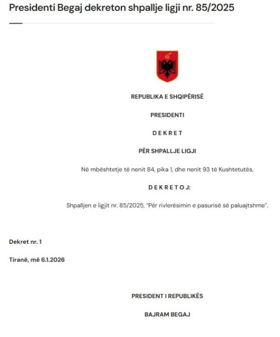 Dekreti i kreut të shtetit dhe i publikuar nga institucioni, mban datën 6 janar 2026. Ligji synon t’u japë mundësi qytetarëve të rivlerësojnë pronat e tyre me kosto më të ulët fiskale, si dhe të përfitojnë nga një normë e reduktuar tatimi në rast të shitjes së pasurisë.