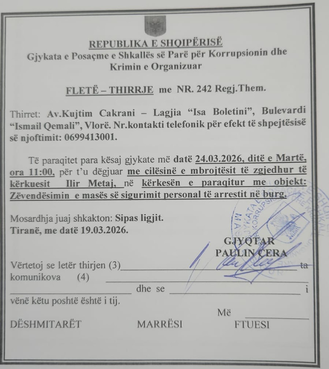 Ish-presidenti i Republikës, Ilir Meta ka depozituar pranë Gjykatës së Posaçme kundër Korrupsionit dhe Krimit të Organizuar kërkesën e radhës për zëvendësimin e masës së sigurisë “arrest me burg” me një masë më të butë, si “arrest shtëpie”, “detyrim paraqitjeje”, “garanci pasurore” ose “ndalim i daljes jashtë shtetit”.