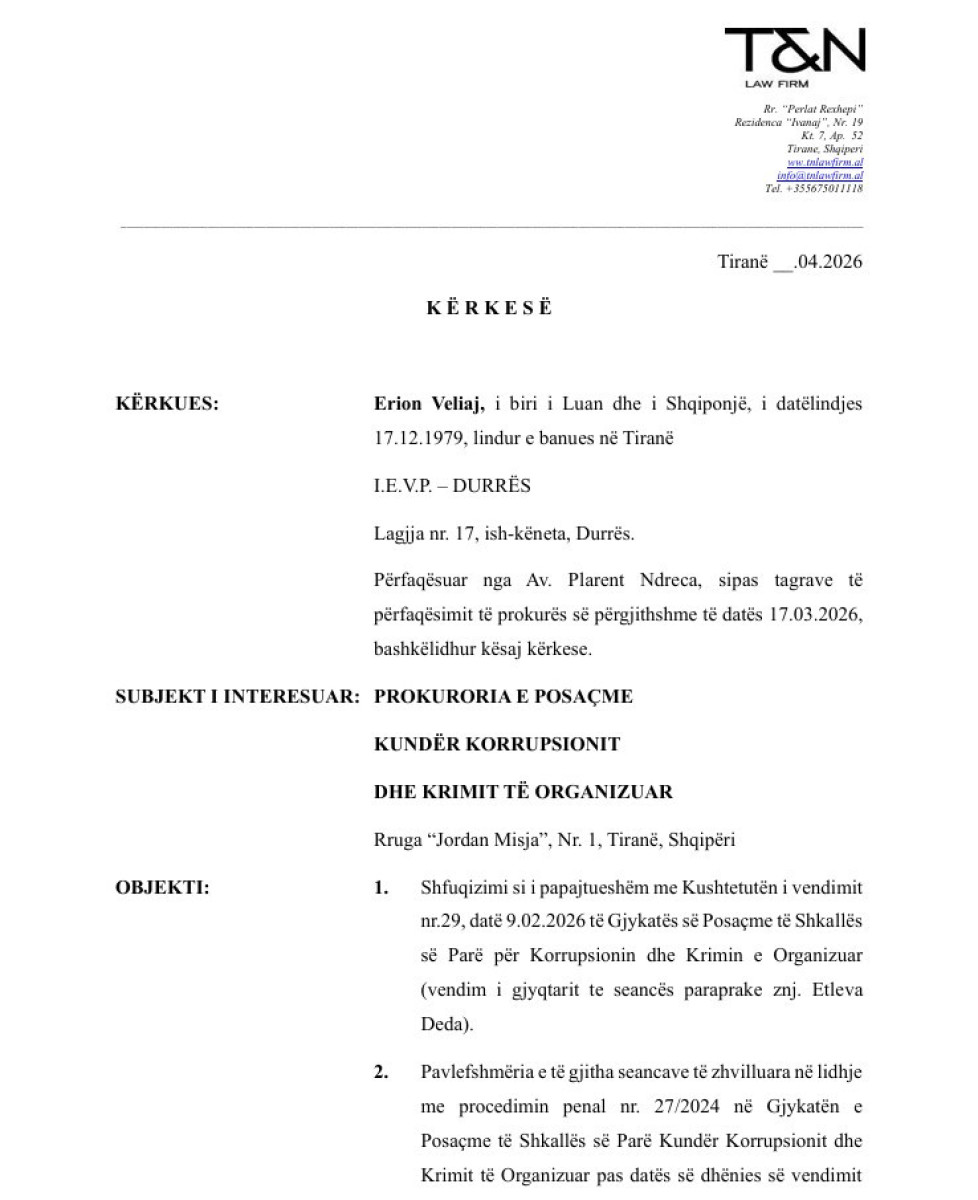 Zyra ligjore që mbron në gjyq Erion Veliajn, pretendon se procedimi nr. 27/2024 ndaj kryebashkiakut të Tiranës është mbështetur në një dokument të firmosur nga një person i vetëquajtur “Nesti Angoni”, i cili, sipas verifikimeve zyrtare nuk rezulton të ekzistojë në regjistrat e gjendjes civile.