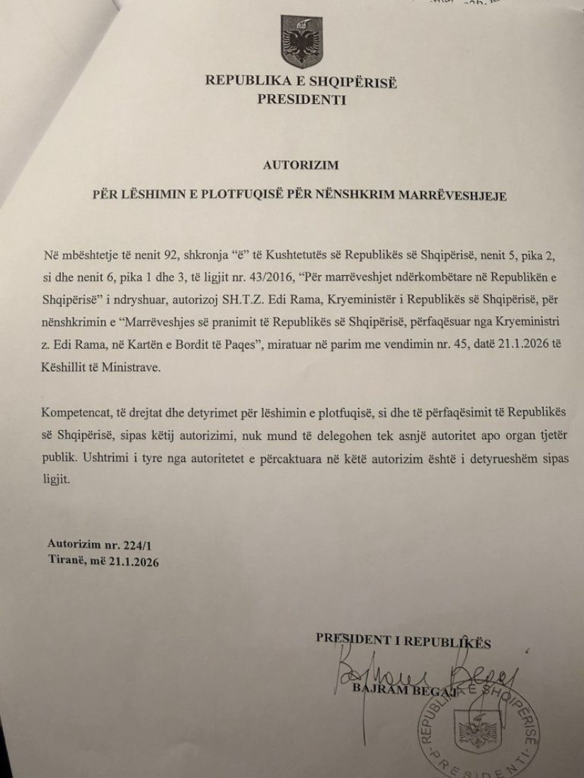Në mënyrë formale, kryeministri Rama ka marrë edhe autorizimin e presidentit Bajram Begaj, për ta firmosur ai marrëveshjen. Aty theksohet se kompetencat, të drejtat dhe detyrimet që rrjedhin nga lëshimi i kësaj plotfuqie, si edhe përfaqësimi i Shqipërisë në “Bordin e Paqes”, nuk mund të delegohen te asnjë autoritet tjetër publik.